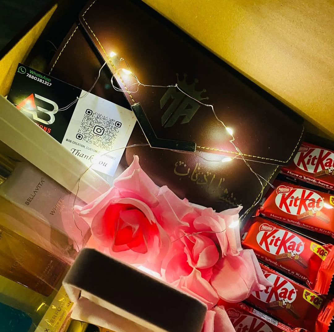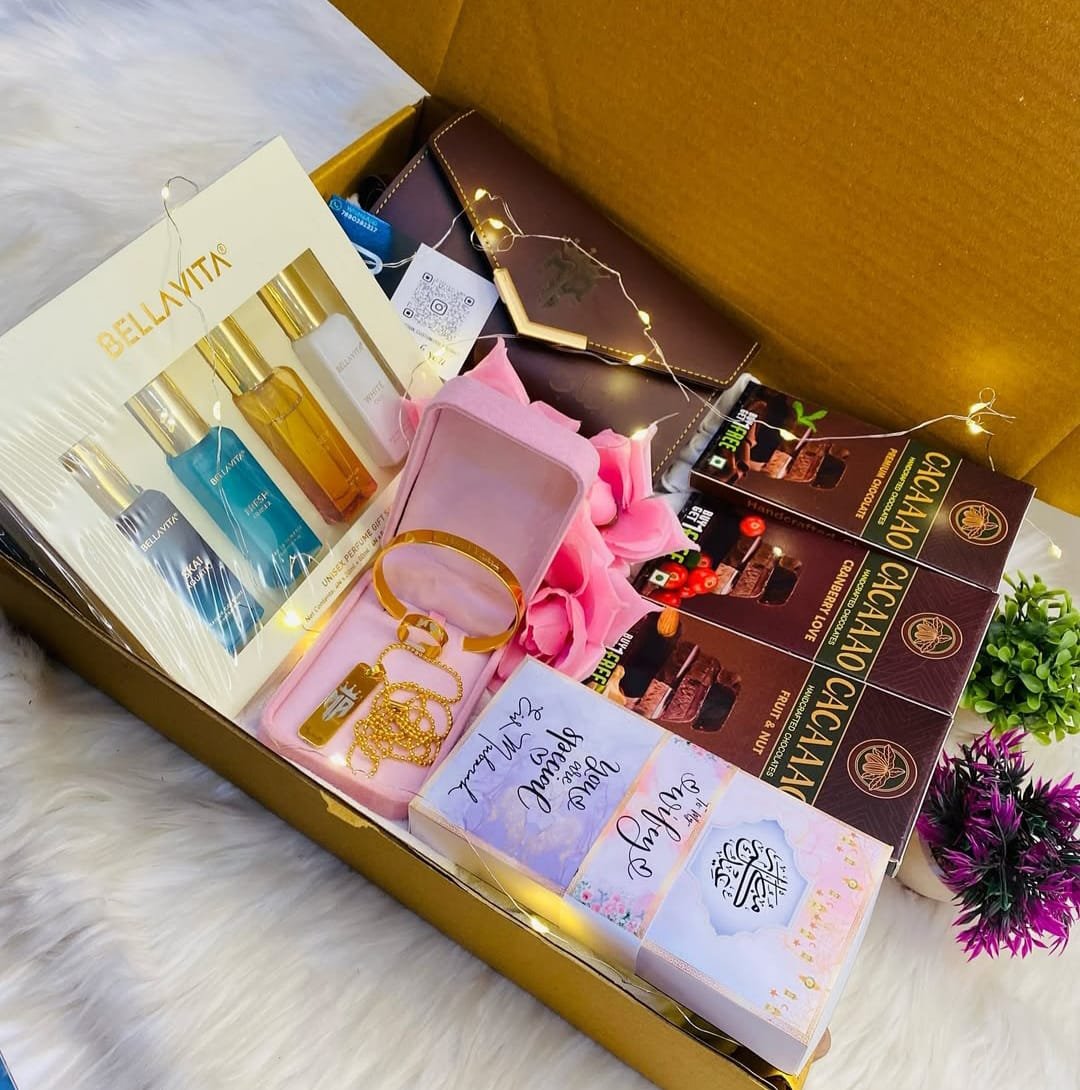 Perfume set, Locket, Ring, Ban gle, Popup eidi box, Chocolate, Purse combo